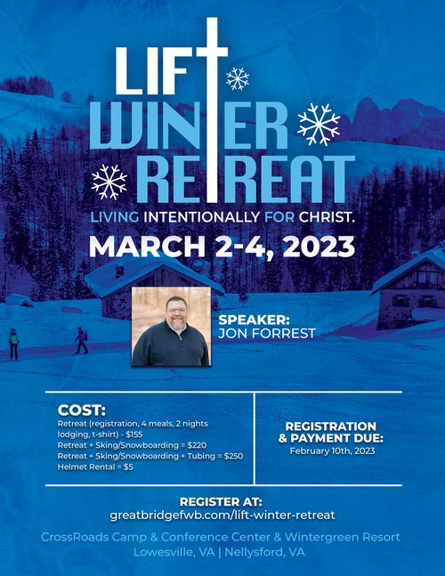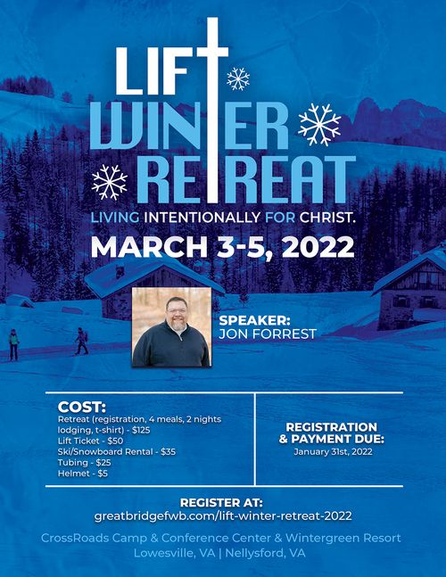 LIFT Winter Retreat is a retreat for students in 6th-12th grade. This will be an exciting getaway filled will games, fun on the slopes, great memories with friends, worship, and preaching from Jon Forrest.